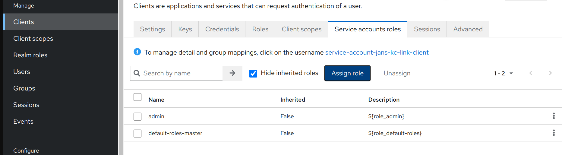 Service accounts roles, assign roleadminto the client usingAssign rolebutton