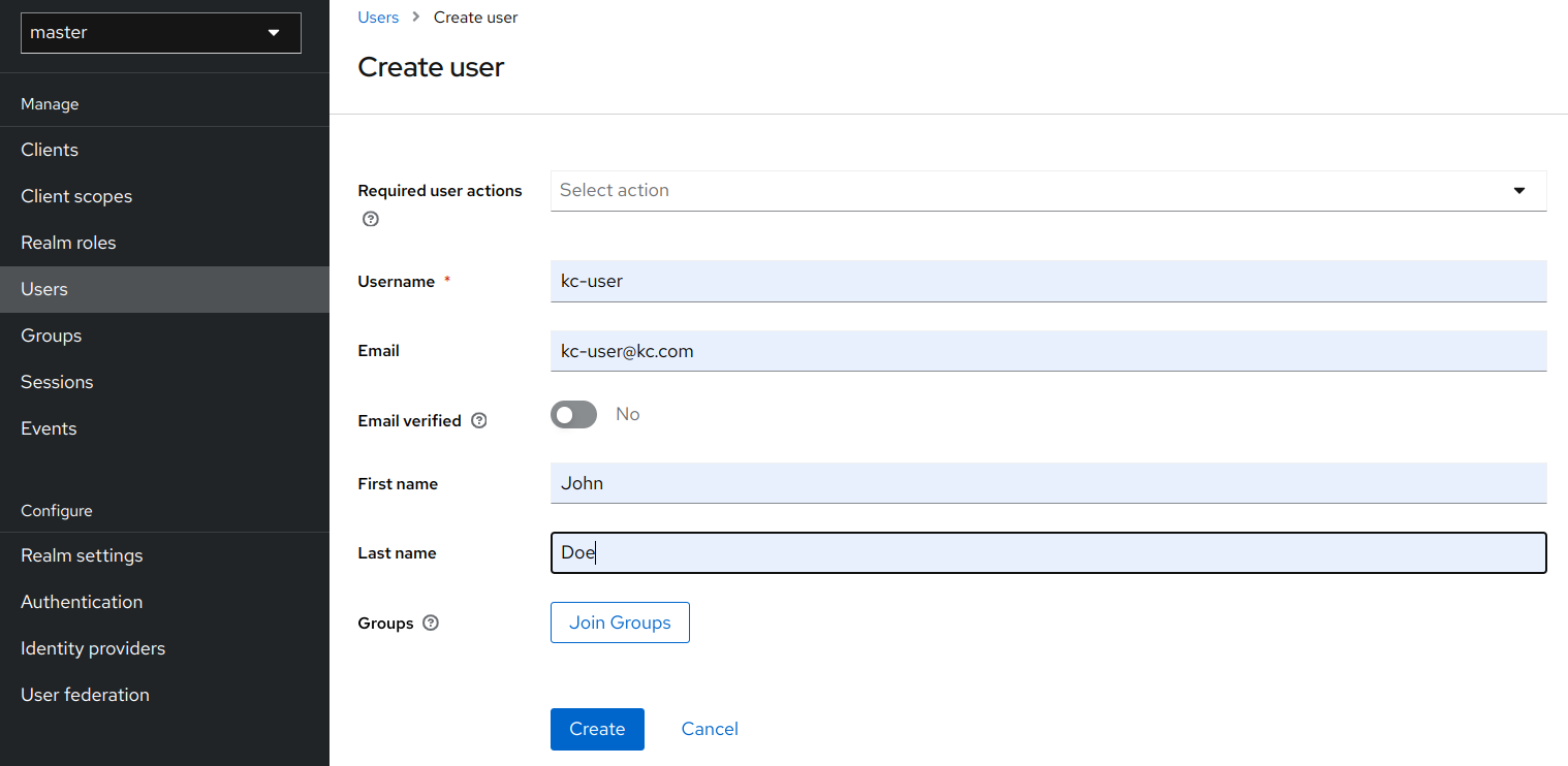 - Create a user in the Keycloak server. The user should have permission to