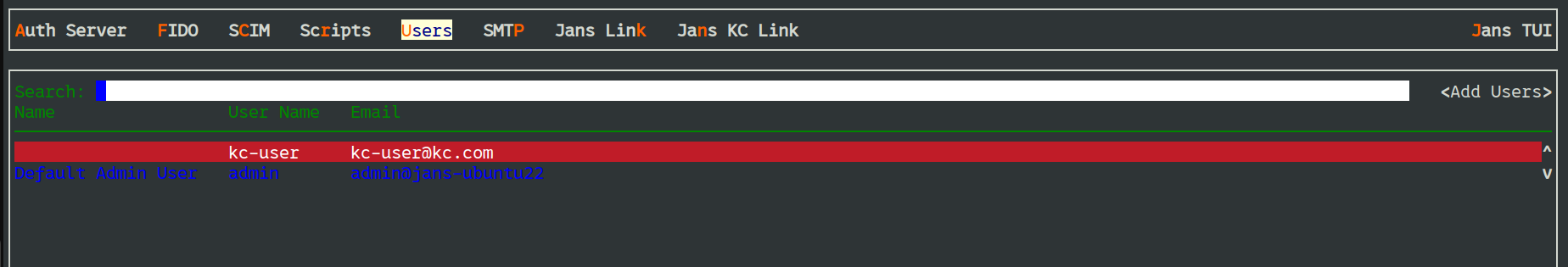 Use TUI to see the list of available users in Janssen Server.
