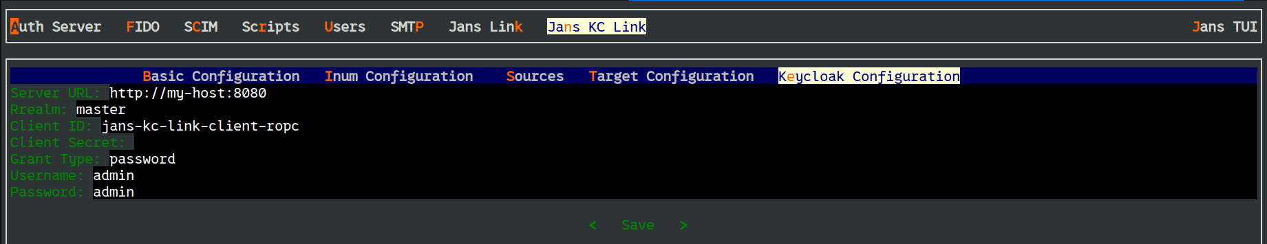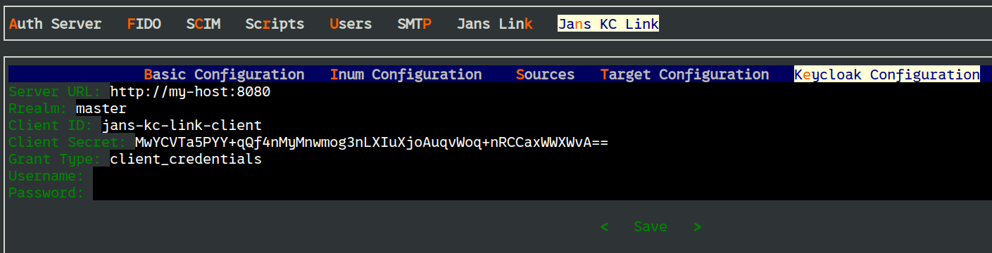Jans KC Link->Keycloak Configuration, and configure following parameters: Server URL: Keycloak Server URLRealm: Keycloak RealmClient ID: ID of the newly created client on KeycloakGrant Type: Set this as passwordUsername: Set this as adminPassword: Password of admin user