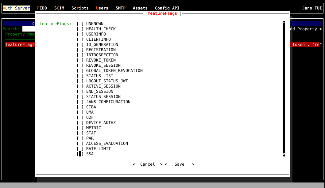 When using TUI, navigate via Auth Server->Properties->enabledFeatureFlags to screen below. From here, enable or